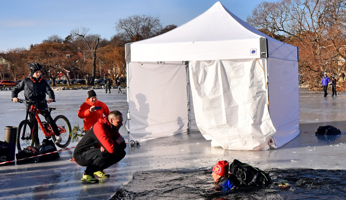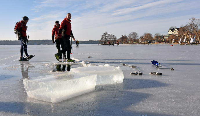 Waar de Zweden goed in zijn, is het omgaan met de veiligheid op het ijs. Wie op onbekend ijs stapt, neemt altijd een rugzak en ijspriemen mee. Hoe goed dit werkt, zien we bij een demonstratie van twee schaatssters die vrijwillig een wak inrijden en dan op de kant klimmen. Goed om te zien hoe goed dit werkt: de rugzak houd je boven water en met de ijspriemen klim je het ijs op.