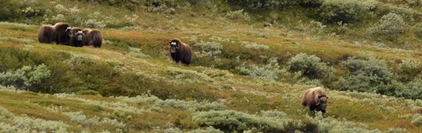 Wie het Noorse Dovrefjell in trekt heeft de kans ze te zien: de muskusossen, een diersoort dat ooit Scandinavië op diverse plaatsen bevolkte. Ze trekken tussen de struiken door om zich goed te voeden voor de barre winter die volgt na de korte zomerperiode.